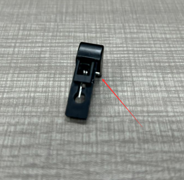 Der markierte kleine Metallstift (Nagel) hält den Hebelmechanismus seitlich im Wallet-Gehäuse. Er sorgt dafür, dass der Hebel stabil bleibt und sich beim Drücken korrekt bewegt. Beim Ersatzteil ist dieser Nagel bereits vormontiert und mit einer Gummisicherung fixiert. Achte beim Entfernen der Sicherung darauf, dass der Nagel nicht herausfällt – er ist entscheidend für die Funktion des Hebels.