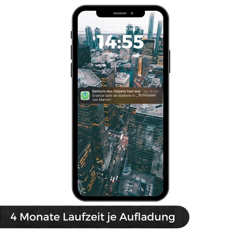 Deine Schlüssel bleiben 3 bis 4 Monate lang auffindbar, ohne ständiges Aufladen. Bei niedrigem Akkustand erhältst Du eine Push-Benachrichtigung. Zudem fallen keine monatlichen Kosten oder Abonnements an.