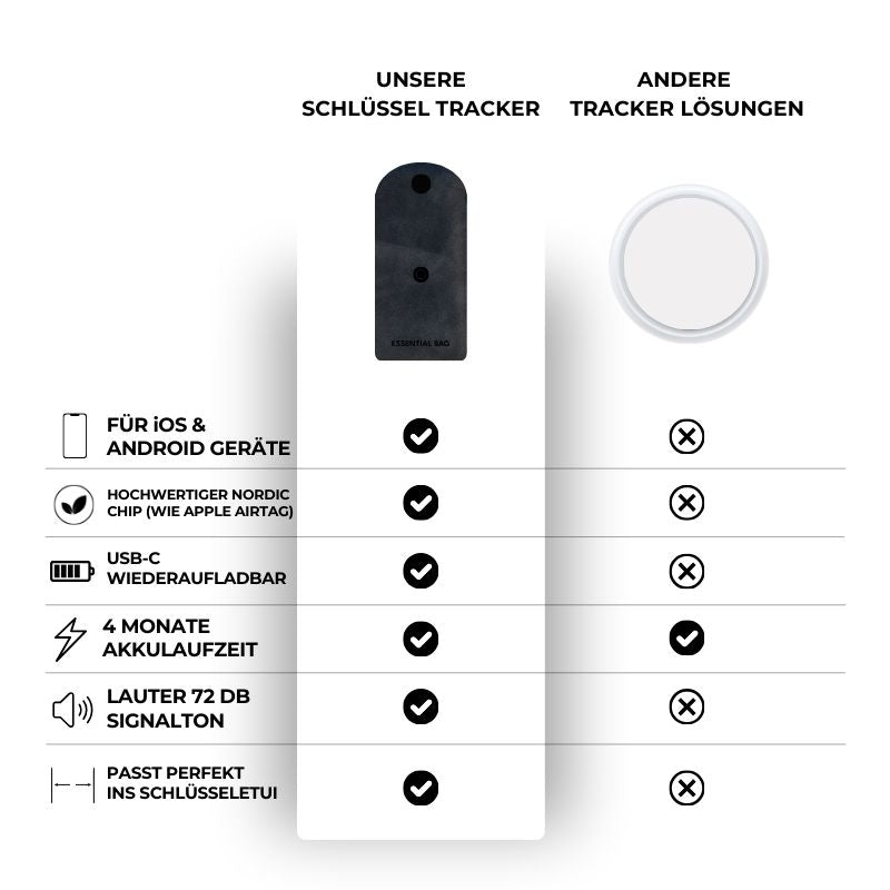 Im Gegensatz zu vielen anderen GPS Trackern benötigt der Essentialbag Schlüssel Tracker weder SIM-Karte noch ein monatliches Abo. Einmal gekauft, genießt du volle Funktionalität – ohne versteckte Kosten. Dein smarter Schlüssel-Finder funktioniert dauerhaft – ganz ohne laufende Gebühren.