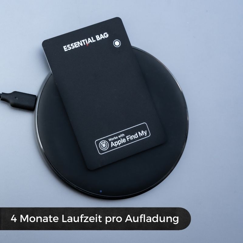 Effizientes Wireless Charging: Die Essentialbag Tracker-Karte benötigt keine ständigen Batteriewechsel. Einmal aufgeladen, hält der Akku für 10 Monate, sodass Sie sich weniger Gedanken um das Aufladen und mehr um das Wesentliche machen können.